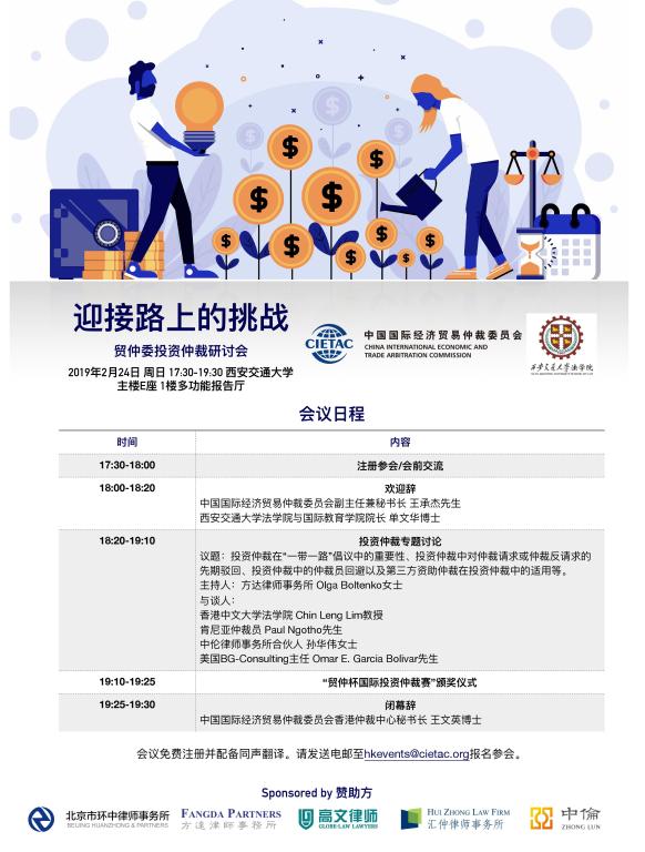 贸仲委投资仲裁研讨会暨“贸仲杯国际投资仲裁赛”颁奖仪式将于2019年2月24日下午5:30-8:00在万搏·体育主楼E座多功能报告厅举办,诚邀各位师生参加!