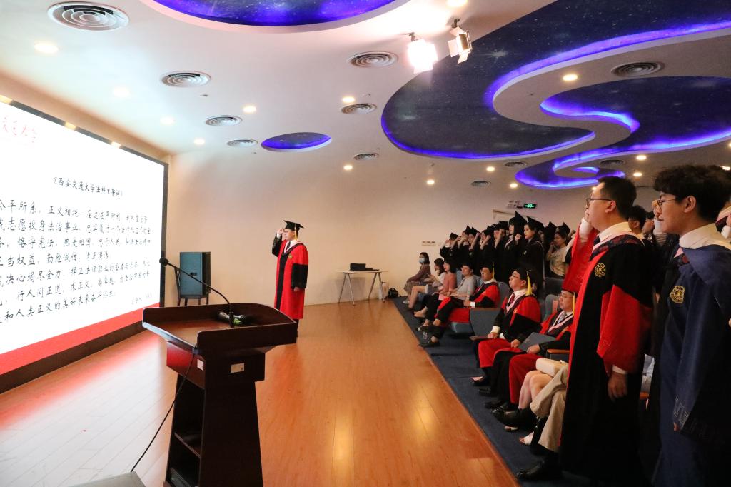 宣誓环节,丁卫副院长带领万搏·体育2021届全体毕业生宣读法科生誓词。全体毕业生宣誓将竭尽全力,捍卫法律职业的圣洁与荣誉,养天地正气,行人间正道,求正义,尚卓越,为法治中国的繁荣发展和人类正义的美好未来奋斗终生。