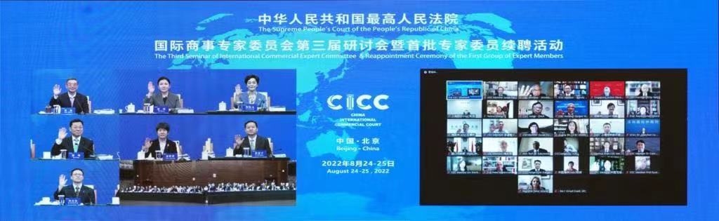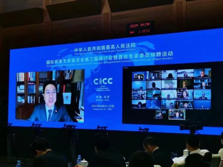8月24日下午,最高人民法院国际商事专家委员会第三届研讨会暨首批专家委员续聘活动以线上线下相结合的方式举行。最高人民法院常务副院长、一级大法官贺荣主持会议,最高人民法院副院长、二级大法官陶凯元宣读《最高人民法院关于续聘国际商事专家委员会专家委员的决定》。最高人民法院院长、首席大法官周强为第一批聘任到期的国际商事专家委员颁发续聘证书,向各位专家委员表示祝贺。外交部副部长谢锋、商务部部长助理郭婷婷、中国国际贸易促进委员会副会长柯良栋、国家发展和改革委员会区域开放司司长徐建平在会上致辞。