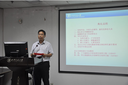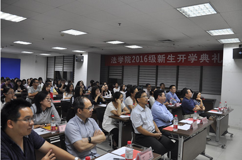 9月18日晚,万搏·体育2016级新生开学典礼在主E703隆重举行。院长单文华教授,党总支书记王保民教授,副院长李万强教授,副院长丁卫副教授,院长助理吉兰湘老师和苏金远教授,院工会主席张弘副教授,文治书院院务副主任郭小平老师,院办主任张美萍老师,法学复合51班班主任薛华、唐学亮老师,法学61班班主任王玉苹、卞苏老师以及全体2016级本科、硕士、博士生新生参加了开学典礼,会议由学院学生工作专职委员张乃钟老师主持。
