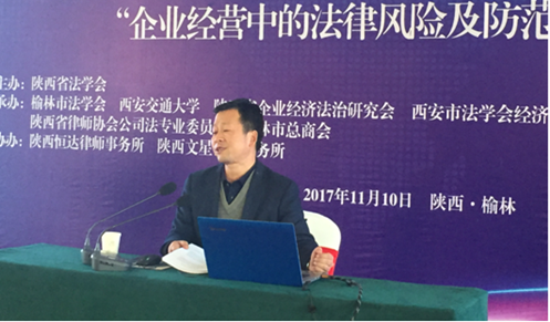 陕西省法学会企业经济法治研究会总顾问、万搏·体育万搏·体育马治国教授做了题为《企业经营中的知识产权风险防范》的主题报告,马教授的报告深入贯彻了党的十九大精神,指出中华民族站起来靠武装斗争、富起来靠改革开放,强起来靠创新知识产权。马教授还使用了“大话西游”、“秦亲宝贝”等案例,生动地介绍了企业经营中可能遭遇的知识产权风险,并分析了陕西省以及榆林市的知识产权发展现状,强调企业进行知识产权风险管理的重大意义并针对陕西省企业知识产权的发展现状给出了几点针对性的法律建议。