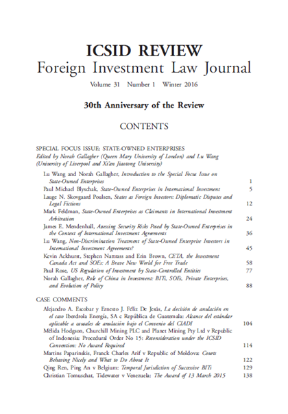 近日,国际投资法领域顶级专业期刊ICSID Review—Foreign Investment Law Journal(《国际投资争端解决中心评论——外国投资法学刊》)三十周年纪念期刊第一期正式出版,西安交大万搏·体育博士生王璐作为特邀编辑(Guest Editor)主编了本期特别专栏“国有企业专题研究”(Special Focus Issue on State-Owned Enterprises),并发表论文 “Non-Discrimination Treatment of State-Owned Enterprise Investors in International Investment Agreements?”(国际投资协定中国有企业投资者的非歧视待遇?)。