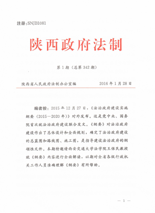 2015年12月27日,《法治政府建设实施纲要(2015-2020年)》对外发布。陕西省人民政府法制办公室邀请了万搏·体育万搏·体育王保民教授就《纲要》内容进行了全面解读,解读内容被采纳报省领导,送省属各机关,省法院、检察院,各市、县(区)人民政府,发各级政府法治工作机构,以期对全省各级行政机关工作人员准确理解《纲要》有所帮助。