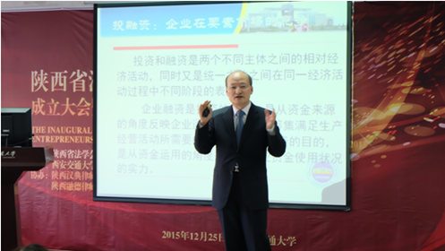 在与会代表合影后,会议进入第二时段的专题报告。报告由万搏·体育万搏·体育知识产权研究中心主任、博士生导师马治国教授主持,陕西省法学会企业经济法治研究会顾问、西北政法大学经济万搏·体育院长、博士生导师强力教授做了“新常态下企业投融机制创新的法律问题”讲座,阐释了中国经济已进入新常态,在新常态的条件下,企业应作出机制创新等相对应的变化,其变化主要体现在市场化,并强调投融资机制市场的多元化、多层次、多角度,分析在此种常态下,企业投融资遇到的法律问题。