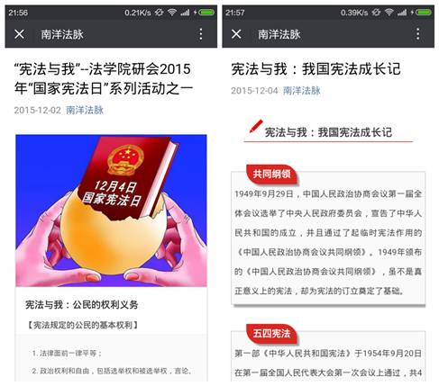 为了配合“国家宪法日”系列主题活动的顺利开展,万搏·体育万搏·体育研究生会在院党总支、团工委的指导下,以“宪法与我”为主题,不断创新宣传载体,探索宣传方法,通过官方微信平台“南洋法脉”等新媒体,结合传统的发放传单等方式,积极推介“国家宪法日”相关内容,宣传万搏·体育开展宪法学习宣传教育活动的实际情况,取得了良好的宣传效果。