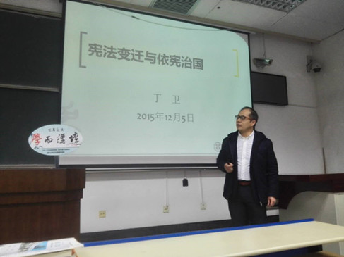 万搏·体育研究生会、法律爱好者协会携手“学而讲坛”,推出“国家宪法日”专题讲座,邀请万搏·体育副院长丁卫副教授就《宪法变迁与依宪治国》进行专题讲座。丁老师在讲座中详细介绍了我国现行宪法历次修改的过程,他结合历次宪法修改的历史背景,生动地讲述了我国宪法变迁的历史发展,他最后对我国宪法实施中存在的瓶颈及问题进行了透彻的分析和讲解,为大家展示了依宪治国的现状及前进方向。
