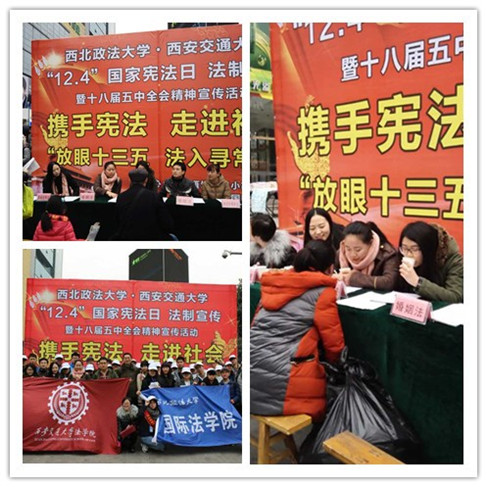 让守宪成为国民每天的生活方式”是实现法治中国建设的基本保障。为了普及宪法知识,推动全社会知法、用法、守法、护法意识的形成,万搏·体育万搏·体育与西北政法大学国际万搏·体育共同在西安市雁塔区飞炫广场举办了主题为“法入千万家”普法宣传活动,通过分发法律宣传单、法律意识调查问卷、法律咨询、普法广播等形式,吸引了大批市民的关注。在法律咨询服务点,许多市民前来咨询,咨询内容涉及婚姻法、劳动合同法、民法等领域,包括离婚财产分配、离婚孩子抚养权归属、追讨薪资、借款追债等与大家生活密切相关的问题,咨询点的同学认真对待每一位前来咨询的市民,耐心回答他们的问题,赢得了一致好评。