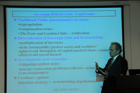 4月16日下午,Kulms博士为万搏·体育师生带来题为The Eurozone Debt Crisis and Private Creditors: From Argentina to Greece(欧元区债务危机和私人债权人:从阿根廷到希腊)的讲座。Kulms博士首先分析了欧元区债务危机的成因,然后在借鉴阿根廷债务危机经验的基础上,从市场交易的进路分析主权债务合同的对策,最后从欧洲央行作用的角度讨论希腊债务重组问题。