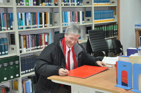报告后,Rolf Fife司长来到万搏·体育。万搏·体育院长单文华教授会见了Rolf Fife司长,并带领他参观了学院文化大厅和丝绸之路国际法与比较法研究所。Rolf Fife司长对研究所的研究条件赞不绝口。他在嘉宾册上写下感想,希望研究所成为国际交流的桥梁,并祝愿中挪友谊健康发展。随后,他和研究人员合影留念。