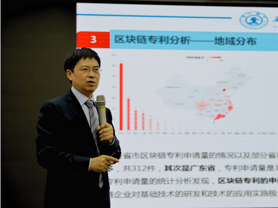 马治国教授紧扣本次论坛的主题“区块链+知识产权”,从专业的角度就区块链技术本身的专利问题发表了精彩的演讲。他指出,区块链与知识产权的结合相当广泛,基于区块链的版权存证系统已经逐渐进入公众视野,而除此之外,区块链技术本身的专利问题也是二者最密切的结合点之一。报告伊始,马教授首先结合工信部信息中心发布的《2018中国区块链产业白皮书》介绍了区块链行业的发展概况、市场规模以及行业结构。接着他介绍了目前区块链技术的专利申请与专利布局情况,并从申请态势、地域分布、专利技术构成以及专利技术分布等方面对目前全球的区块链技术专利进行了深入分析。通过中美在区块链技术专利的申请量以及PCT专利申请情况的对比,他指出,目前中国的区块链技术专利布局较全,总申请量很大,在世界范围内处于领先地位,但同时PCT专利的缺乏也反映出了中国的区块链技术专利还存在质量不高、国际视野缺乏等问题。报告最后,马教授还对区块链技术的专利申请与专利布局发表了见解和建议。