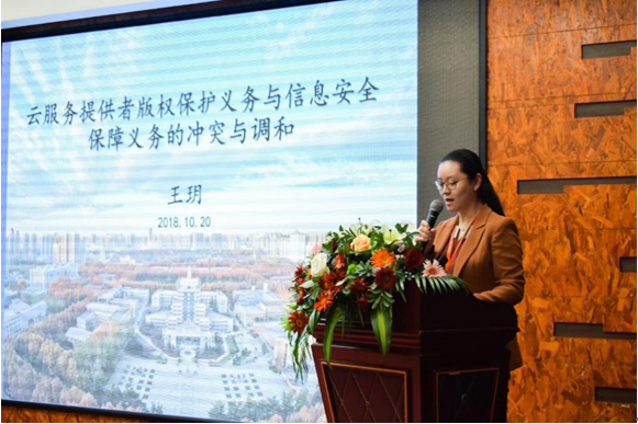 万搏·体育信息安全法律研究中心副主任王玥作了《云服务提供者版权保护与信息安全保障义务的冲突与调和》的主题发言。