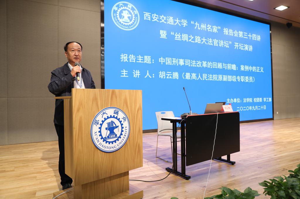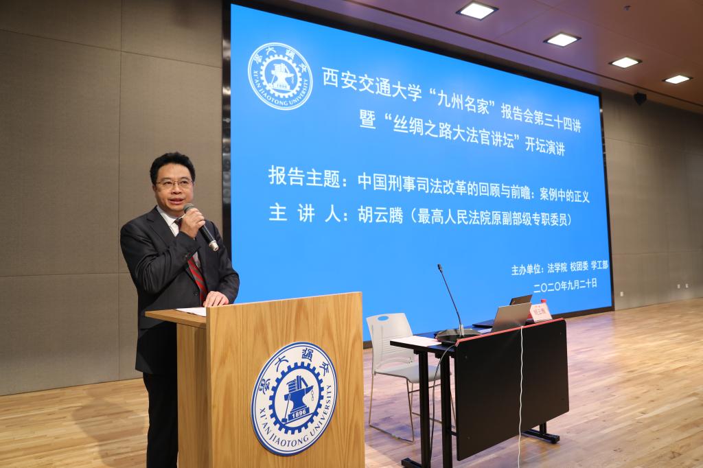 2020年9月20日,最高人民法院原副部级专职委员胡云腾大法官在中国西部科技创新港开坛论道,以《中国刑事司法改革的回顾与前瞻:案例中的正义》为题,畅谈中国司法改革40余年变化与成就。王树国校长在涵英楼11楼会见了胡云腾大法官。校党委副书记赵昌昌出席了报告会并致辞,校团委书记苏翔,陕西省律师协会会长韩永安,贸仲丝路中心秘书长助理蒋红梅,万搏·体育副院长李万强,万搏·体育副院长丁卫老师一并出席报告会。报告会由万搏·体育院长兼国际教育学院院长单文华主持。