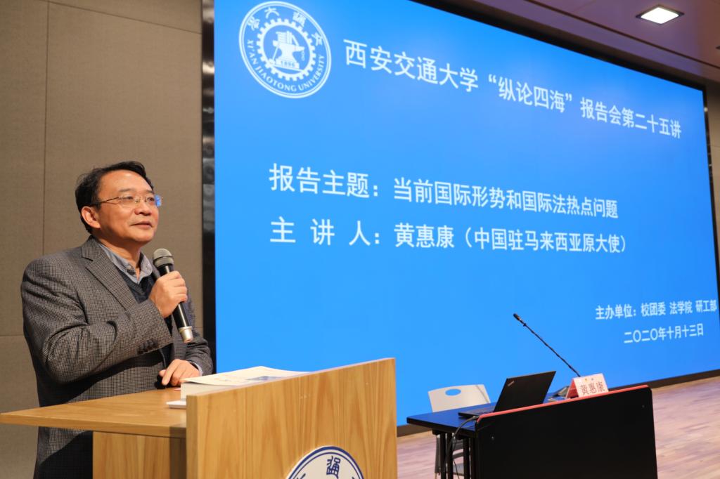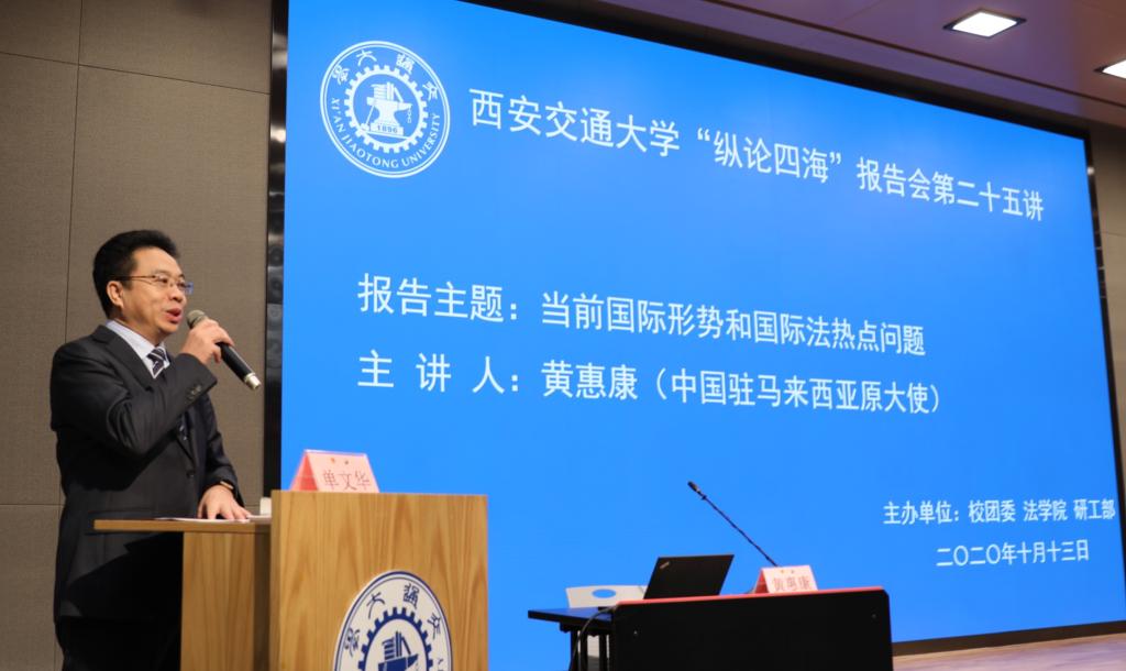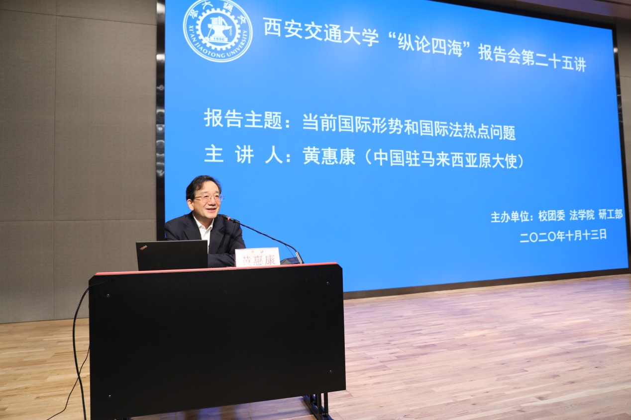 上午9:30分,黄惠康大使主讲的 “当前国际形势与国际法热点问题”专题报告会在新港报告厅举行。本次报告会是万搏·体育“纵论四海”系列高端报告会的第二十五讲,同时是学校党委理论学习中心组和全体校管干部的一次集中辅导报告会,亦是我校法学研究院特别是丝绸之路国际法与比较法研究所和丝绸之路经济带法律政策协同创新中心的“科创月”系列活动之一。万搏·体育副校长席光教授出席报告会并致辞,报告会由万搏·体育院长兼国际教育学院院长单文华教授主持。全校百余名学校正处级领导干部以及其他四百余名师生现场参会。同时,全校其他副处级以上校管干部则在线参加了报告会。