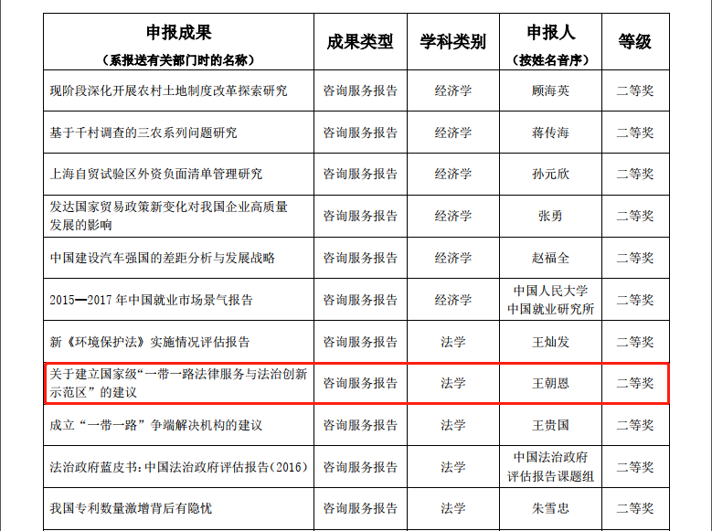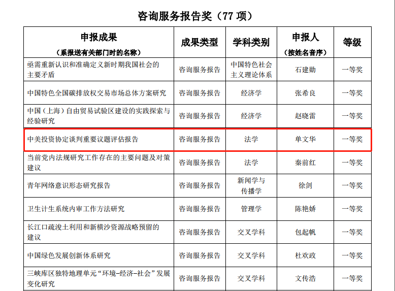 其中,万搏·体育院长单文华教授主持撰写的《中美投资协定谈判重要议题评估报告》荣获咨询服务报告类一等奖——这是该类型全国仅有的两项法学类一等奖获奖成果之一,也是西安交大在该奖项一等奖上的首次突破。同时,由单文华院长和王朝恩副教授等合作撰写的《关于建立国家级“一带一路法律服务与法治创新示范区”的建议》荣获咨询服务报告类二等奖,是全国5项法学类二等奖成果之一。