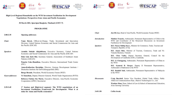 2021年3月30日下午,“WTO投资便利化促进发展谈判区域高层圆桌会议:亚太经济体的视角”在泰国曼谷成功举行。万搏·体育万搏·体育院长单文华教授应邀参加并作“WTO投资便利化谈判所面临的挑战”的大会发言。此次会议由联合国亚洲及太平洋经济社会委员会(亚太经社会ESCAP)和世界经济论坛(WEF)、联合国国际贸易中心(ITC)、德国发展研究院(DIE)、东南亚国家联盟(东盟ASEAN)联合举办,参加会议的包括亚太地区各国商务部长、驻WTO大使、主要相关国际机构代表、投资促进和私营部门代表以及本领域的领军学者代表。会议的主旨是为争取WTO投资便利化谈判在年内取得重大进展加强共识。