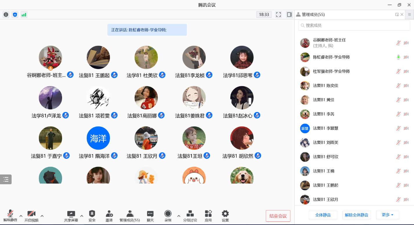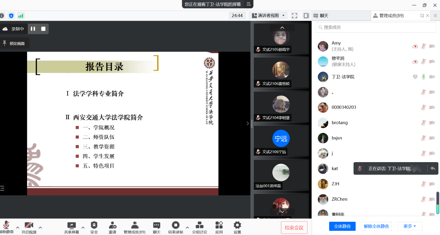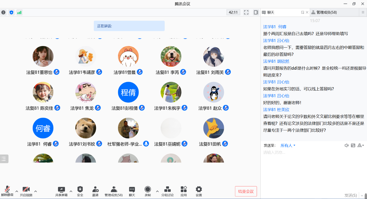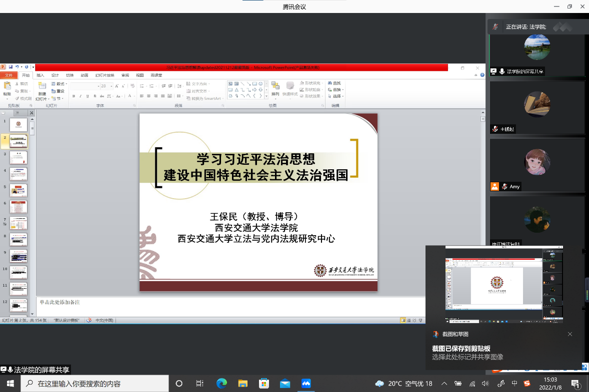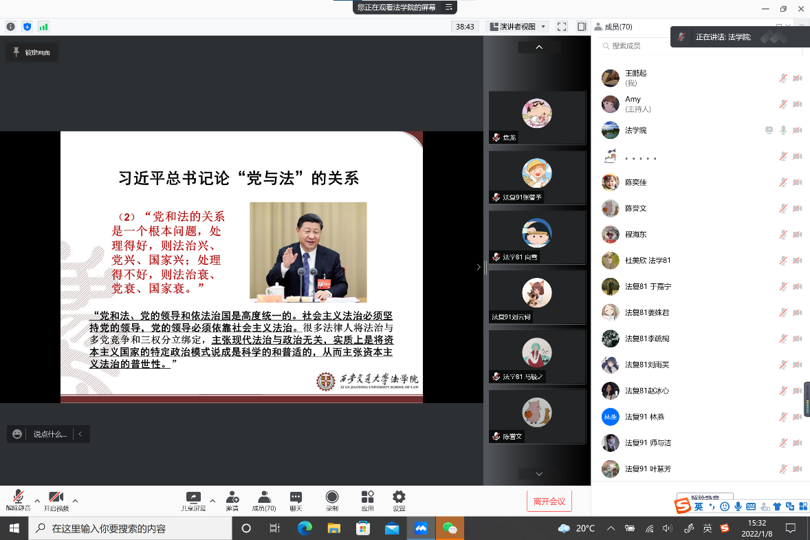 2022年1月8日上午,2020级学业导师和班主任与2020级全班同学齐聚在线会议。三位老师设身处地以共情分享的方式指导同学们合理进行生活安排,制定学习规划,和同学们交流分享老师们在疫情期间怎么工作安排,科研学习计划制定,锻炼健身等。薛华老师以“习近平总书记一直倡导的家风建设”为题,鼓励法学专业的同学们疫情期间,主动在宿舍这个小家庭里建立良好的互帮互助的社风,温暖周围每一位同学!