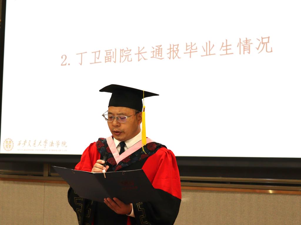 丁卫副院长首先通报了2023届毕业生情况,他表示,本届万搏·体育毕业生在各自领域展现出了出色的才能和潜力,经过长时间的学习和实践,他们成功地进入了国内外知名律师事务所、政府机构、企业法务部门、研究机构以及高等院校等各个领域,将为社会的发展和法治建设贡献自己的力量,展现出法学专业研究生的优秀素养和综合能力。