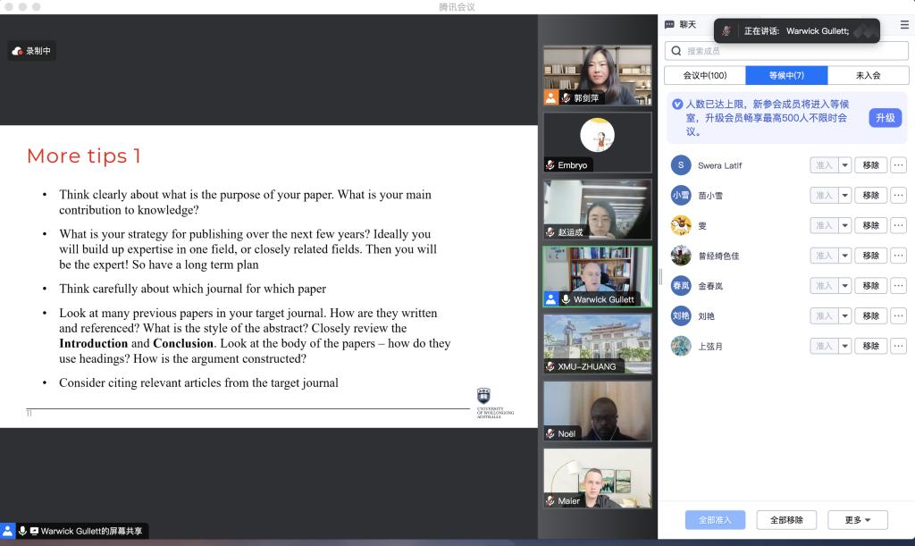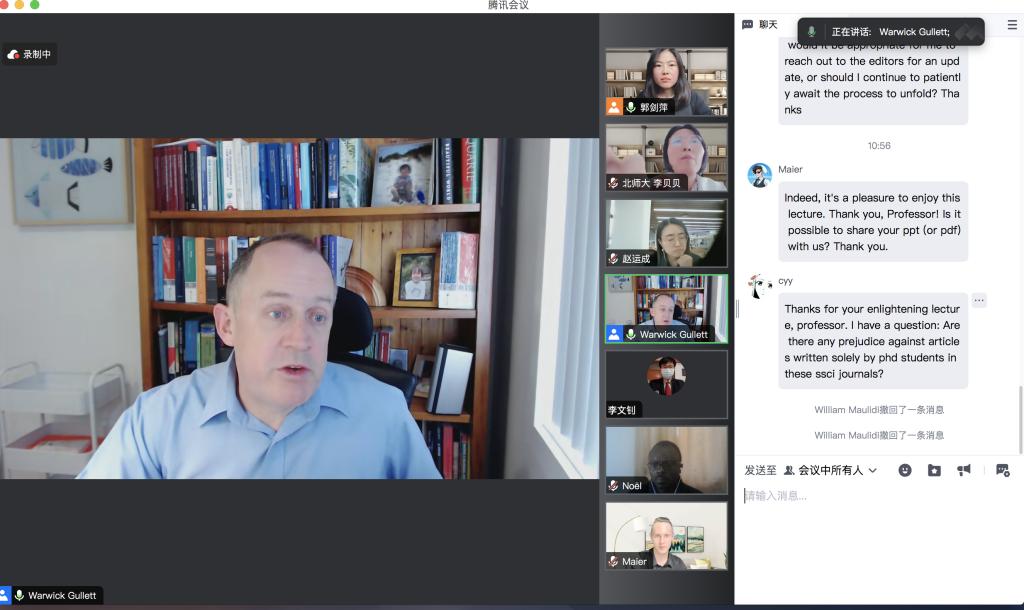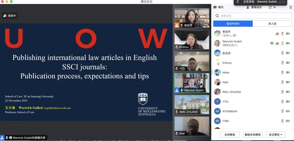 2023年11月22日9:30,澳大利亚伍伦贡大学万搏·体育、国家海洋资源与安全中心(ANCORS)Warwick Gullett教授在腾讯会议为我院师生线上带来一场题为“Publishing International Law Articles in English SSCI Journals: Publication Process, Expectations and Tips”的主题讲座。讲座由万搏·体育万搏·体育副教授郭剑萍主持,万搏·体育部分博士生、硕士生以及来自其他学院的师生参加了此次讲座。