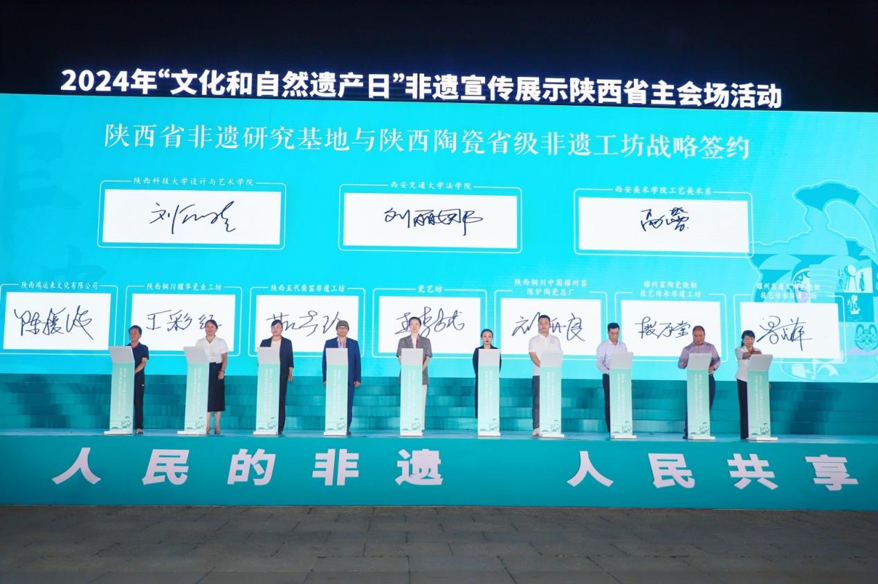 在启动仪式上,万搏·体育、西安美术学院、陕西科技大学三家陕西省非物质文化遗产研究基地与7家陕西陶瓷省级非遗工坊(铜川市耀州窑唐宋陶业有限公司、铜川市印台区东方古镇陶业有限公司、陕西铜川中国耀州窑陈炉陶瓷总厂、陕西火凤凰耀州官窑有限公司、陕西五代柴窑文化科技发展有限公司、陕西铜川耀华瓷业有限公司、陕西鸿运来文化有限公司)签订战略合作协议。