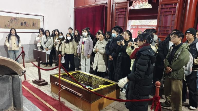 在讲解员的带领下,师生们首先参观了南庵。映入眼帘的是祭祀广场,国内现存最高的孙思邈雕像立于其上,随后的文昌阁,千年古松穿檐而生,寓意人与自然和谐共处。在金殿里,石棺正面刻着的浮雕飞龙怒目回首,背面的刻线飞虎凶猛异常;在元殿里,元代壁画《朝元图》栩栩如生,是陕西境内现存年代最早的道教宫观壁画。