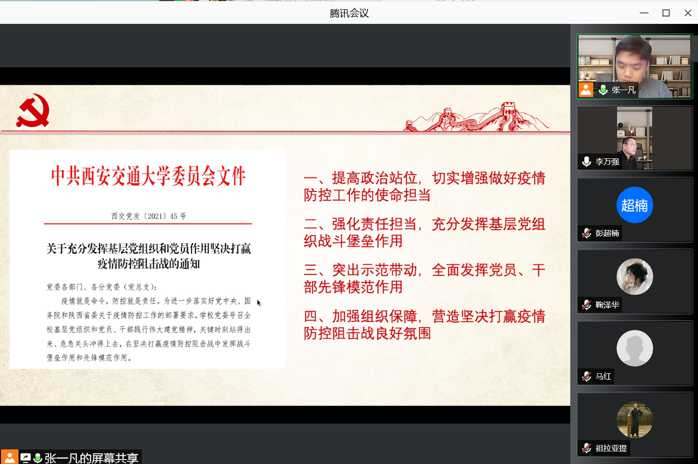 12月31日上午,万搏·体育硕1173党支部召开线上组织生活会,深入学习落实上级党委关于疫情防控的相关文件精神。党支部成员及入党积极分子代表共计15人参与本次会议,万搏·体育副院长李万强教授出席。会议由党支部书记张一凡主持。