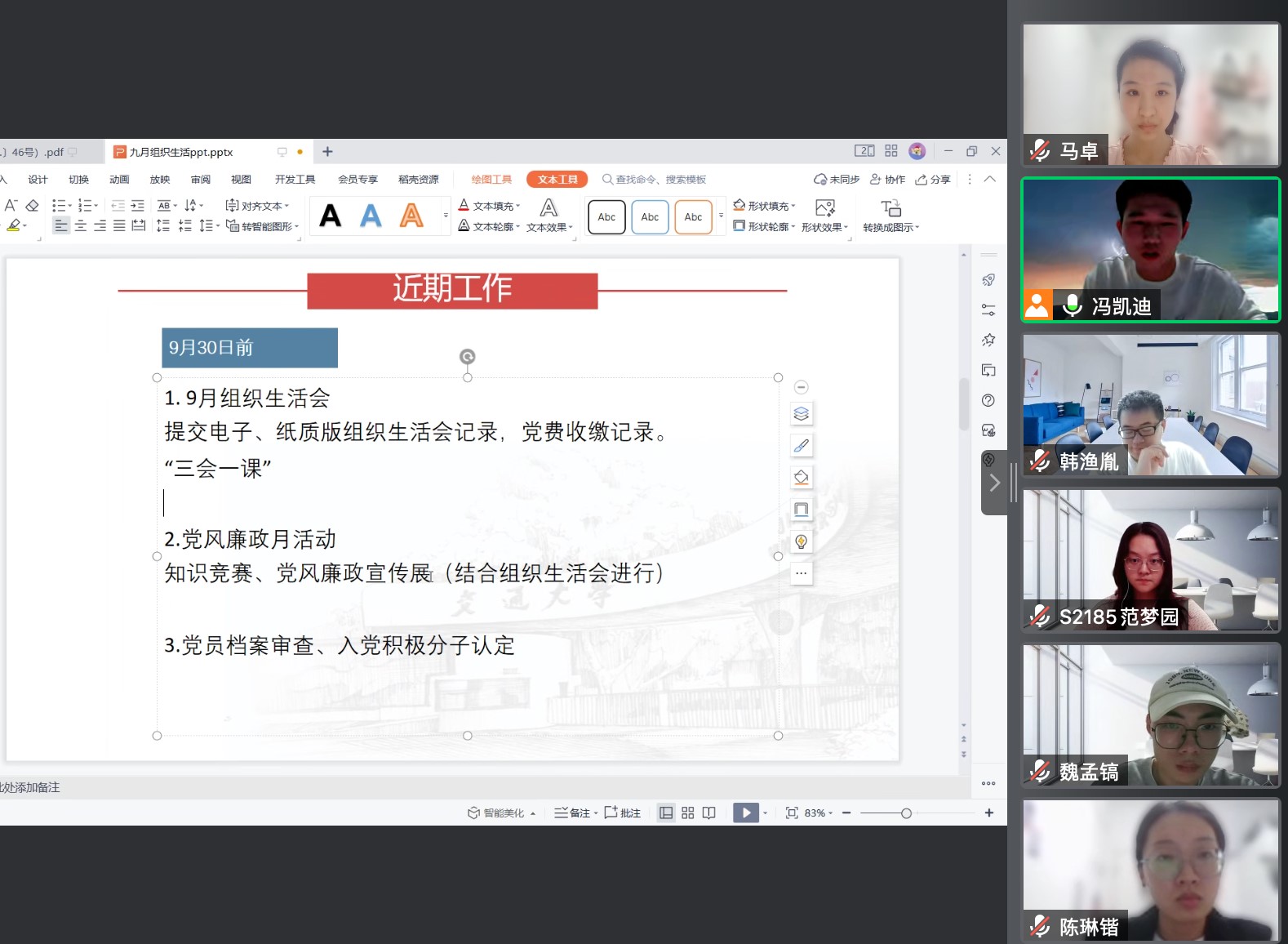 2022年9月27日晚,万搏·体育硕2185党支部举行了九月组织生活会,也是本支部的第一次会议。根据疫情防控相关要求,本次组织生活会采用线上的方式进行。本次会议由党支部书记冯凯迪主持,党员及入党积极分子共15人参加会议。