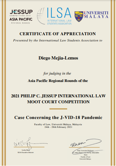 From 26 to 27 February 2021, Prof Mejía-Lemos judged a preliminary round and a quarterfinal round in the Jessup Asia Pacific Regional Rounds, organised and hosted by Universiti Malaya. These Regional Rounds attracted over 20 teams in the region.