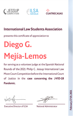 From 17 and 19 February 2021, Prof Mejía-Lemos was invited to judge two preliminary rounds and a semi-final round in the 11thSpanish National Rounds of the Jessup, organised and hosted by global law firm Cuatrecasas. Due to his prior experience judging the Jessup in other countries, he was appointed as presiding judge by the organisers.