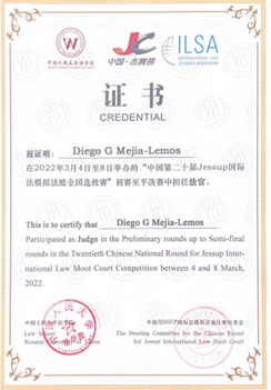 A/Prof Diego Mejía-Lemos LLM PhD, Distinguished Research Associate Professor within XJTU’s ‘Young Talent Support Plan’, has served as judge in the 2022 Philip C Jessup International Moot Court Competition (Jessup), and as an arbitrator in the 2022 Willem C Vis International Commercial Arbitration Moot (Vis), including related competitions preceding the main part of the competition (Pre-Moot).