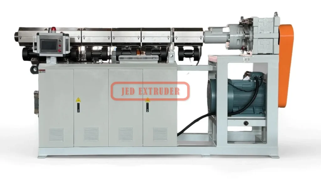 7)中心高度:45台挤出机与100台挤出机平行放置,中心高度为1550mm。挤出机可以通过功率为 550W/380V 的电机驱动螺杆来调节高度。出口处安装有升降按钮,挤出机可以通过直线导轨前后或水平移动,直线导轨用螺栓锁紧。设备颜色:待定